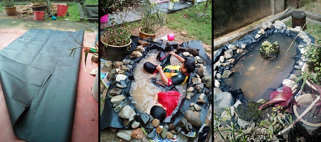 The thing is that, I used black plastic instead of bricks and concrete or cement. The idea is not to make it a permanent pond. Who knows, at a certain time in the future, I would not want it anymore and replace it with something else...